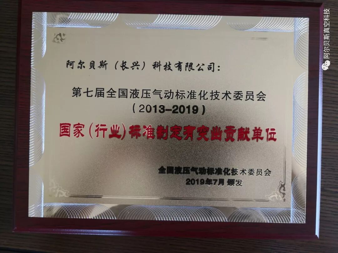 阿尔贝斯总经理胡文静先生受邀参加此次会议,会议期间,委员会授予了阿尔贝斯(长兴)科技 有限公司“第七届全国液压气动标准化技术委员会(2013-2019)国家(行业)标准制定有突出贡献单位”奖,委员会对全体阿尔贝斯人在液压气动领域中充分发挥了行业模范带头作用表示肯定也赞扬。